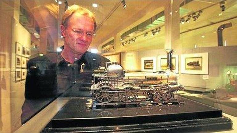 Mit dem Drache begann 1848 der Lokomotivbau in Kassel: Die Nachbildung gehört zur Ausstellung im Kulturbahnhof. Alexander Link (Foto) hat Exponate von Henschel bis Credé zusammengestellt. Foto: Herzog |