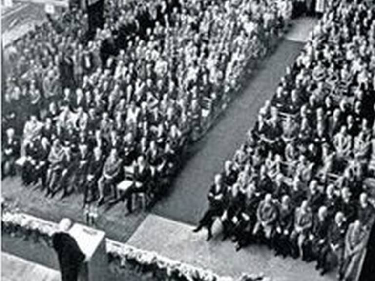 Ansprache in der Lokomotivhalle: Tausende von Henschelanern hörten Bundespräsident Theodor Heuss (vorn am Rednerpult) am 1. Mai 1953 zu. |