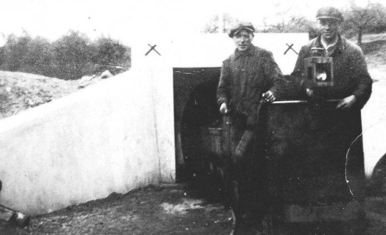Zwei Bergmänner am Eingang der Zeche Heiligenberg: Das Bild entstand um 1950. Drei Jahre später wurde die Zeche geschlossen. Fotos/Repros: Schaake/Stadtarchiv |