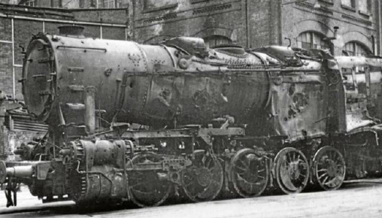 Zerschossene Lokomotive: Die Aufnahme entstand auf dem Werksgelände von Henschel in Rothenditmold. © Henschel-Museum |